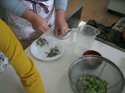 今日の調理実習は「おみそしる」と「ごはん」です。煮干しからだしをとって、おみそしるを作っています。煮干しの頭とはらわたはしっかり取り除いていますよ。
