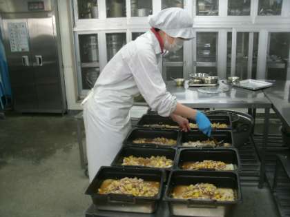 本校の給食調理は民間委託になっています。ナンブフードサービスが給食の安心安全に留意して、金塚小学校児童・松虫中学校生徒・教職員のおいしい給食(約540人分)を作ってくださっています。