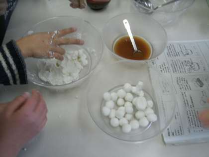 今日は5年生が調理実習に取り組みました。白玉粉を使って、みたらし団子と粒あん団子を作りました。