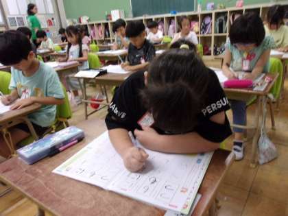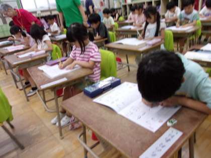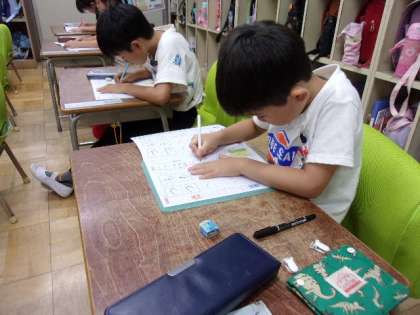 子どもたちは、筆順や形に気をつけながら、特に「とめ」や「はらい」といった細かな部分にも意識を向けて、真剣な表情で取り組んでいました。机に向かう姿勢もよく、集中力の高さがとても素晴らしかったです。
