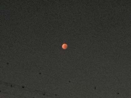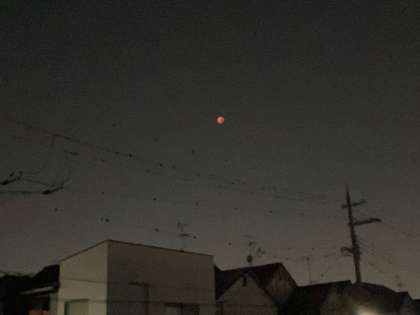 未明に皆既月食がありました。写真は午前3時40分ごろに撮ったものです。地球の影に入った、うっすらと赤い月が見えました。
