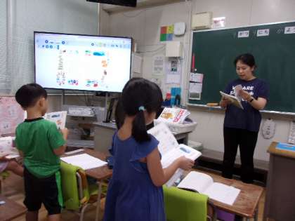「一つ ひるねのくじらが 一とう」など、数字を使った可愛らしい詩をリズムよく読むことで、漢字の読み方を自然と身につけることができます。子どもたちは、元気いっぱいに声をそろえて読み、言葉の響きやリズムを楽しみながら学習していました。