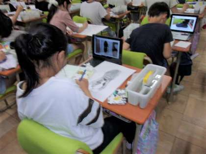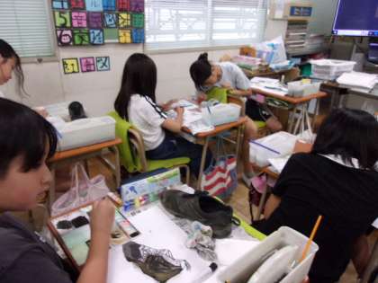 5年生は図工の授業で、「わたしのくつ」というテーマに取り組みました。自分が普段履いているくつをじっくりと観察し、形や色、汚れの具合まで細かく表現することを目指して絵を描きました。
