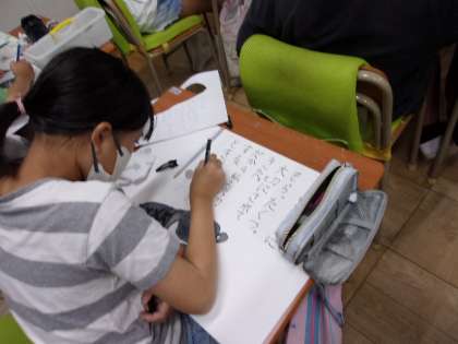 作品が完成した後には、それぞれの絵に詩を添える活動も行いました。「雨の日もがんばったくつ」「遠足でいっしょに走ったくつ」など、くつとの思い出を言葉にすることで、作品にさらに深みが加わりました。