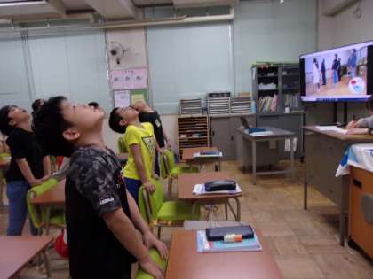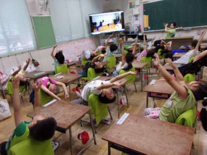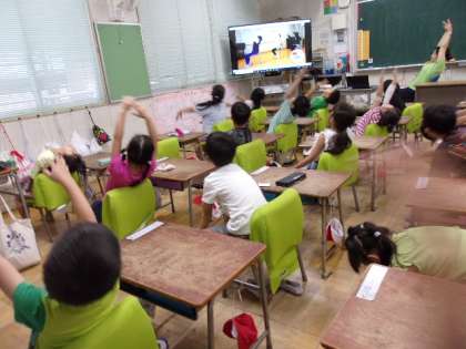 「しせいしせいしせい〜♪」の音楽が鳴ると準備を始め、今日も各教室で、スクリーンに映し出されたインストラクターの動きを見ながら、元気にストレッチを行いました。座ったままでできる動きも多く、机に向かう時間が長い子どもたちにとって、体も心もほぐれる貴重な時間となっています。