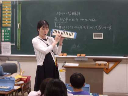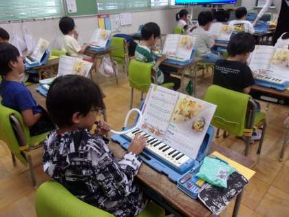 2年生は音楽の授業で、鍵盤ハーモニカを使って「こぎつね」の演奏に取り組んでいます。