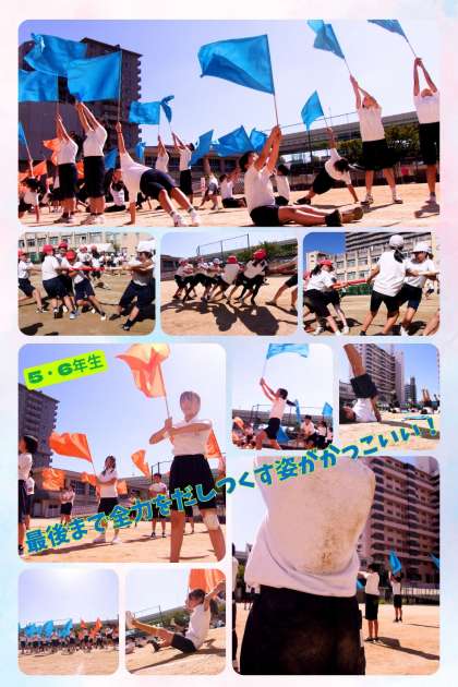 そして、フラッグ演技。青とオレンジの旗が太陽の下で大きく舞い、グラウンドに鮮やかな彩りを添えています。暑い日差しの中、背中に土をつけながらも最後まで全力で取り組む姿は、まさに高学年の誇り。
