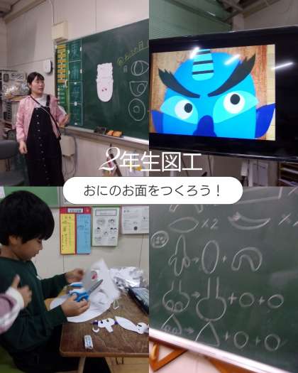 2年生の図画工作では、「おにの顔をつくろう」という学習に取り組みました。画用紙を使って、おにの目やまゆげ、口などのパーツを切り出し、自由に貼り付けて顔を作っていきます。