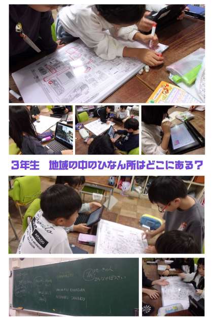 3年生の総合的な学習では、地震・津波・大雨などの災害が起きたときに、どのように避難すればよいかを考える学習を行いました。今回は、自分たちの住んでいる地域にある避難所の場所を地図から探す活動に取り組みました。