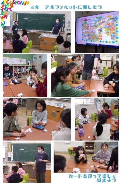 4年生の外国語活動では、アルファベットカードを使った楽しいゲームに取り組みました。ババ抜きのようにカードを取り合いながら、英語の表現を繰り返し練習します。