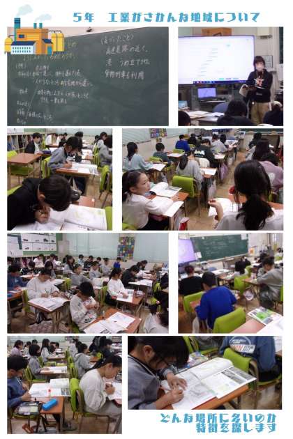 5年生の社会では、工業がさかんな地域について学習しました。今回のテーマは「工場はどんな場所に多いのか?」です。子どもたちは地図や資料を使って、高速道路の近くや港の近くなど、工場が集まる場所の特徴を調べました。