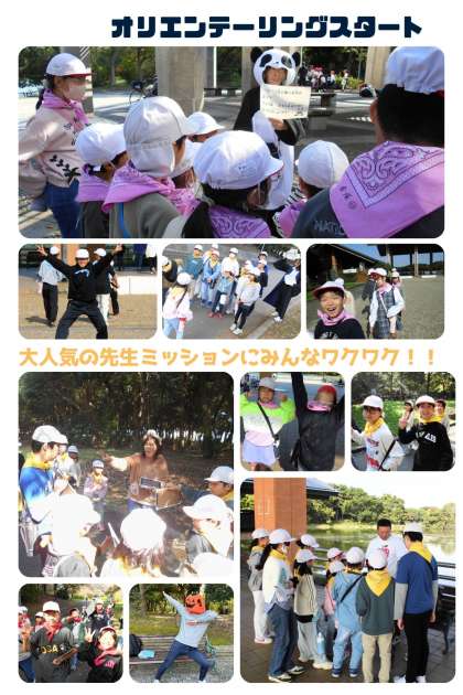今年も大人気の「先生ポイント」が登場!仮装した先生たちが待ち構え、さまざまなミッションを出してくれました。「ちょっと難しいパンダクイズ」「ジェスチャーを当てろ!」など、楽しい課題に子どもたちは笑顔いっぱい。先生たちのユニークな衣装に驚きながら、「おもしろい!」と歓声があがりました。オリエンテーリングを通して、グループの絆がさらに深まり、協力する楽しさを実感する時間となりました。