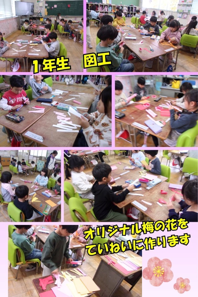 1年生の図工では、春を感じる「梅の花」を作りました。細長い画用紙を束ねて花びらの形を作り、丁寧にハサミで切って仕上げます。子どもたちは、「どんな色にしようかな?」と考えながら、自分だけの色の組み合わせを工夫していました。