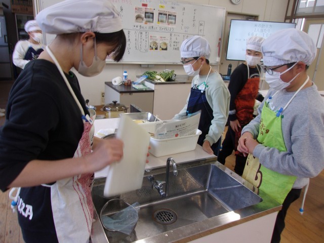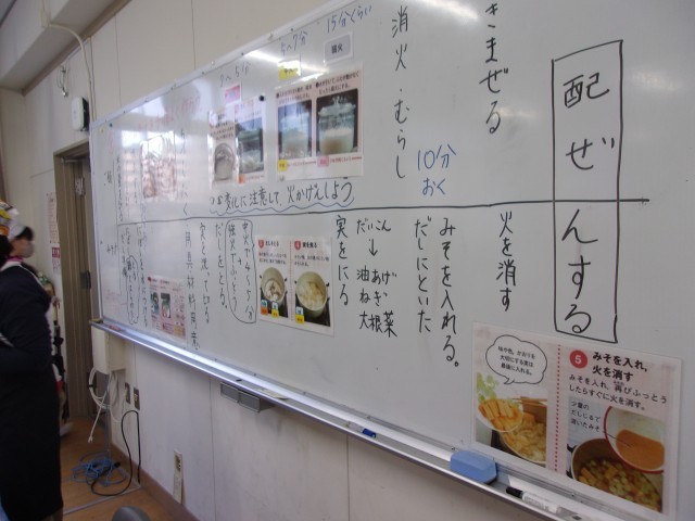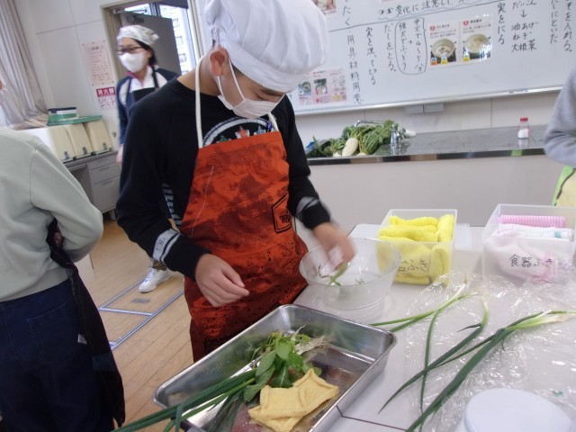 今回の調理実習のテーマは、“最高の一杯をつくる”。育てた大根を主役に味噌汁を作ります。にぼしのだしの取り方や切り方、煮込み方など、今までの学びを総動員して調理に挑戦しました。グループごとに役割分担をし、煮え具合や味のしみ込み具合を確かめながら、協力して一つの料理を仕上げていく姿はとても真剣でした。