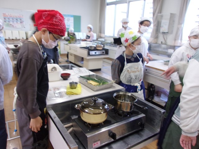 さらに今回は、ガスでご飯を炊く初めての体験にも挑戦しました。火加減を調節しながら炊き上がる様子を見守り、「おこげのにおいがしてきた!」「ふっくら炊けてる!」と、五感を働かせながら学ぶ姿が印象的でした。炊き立てのご飯と大根の味噌汁がそろうと、家庭科室中に「いい匂い〜!」という声が広がり、どの子も満足そうに味わっていました。