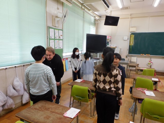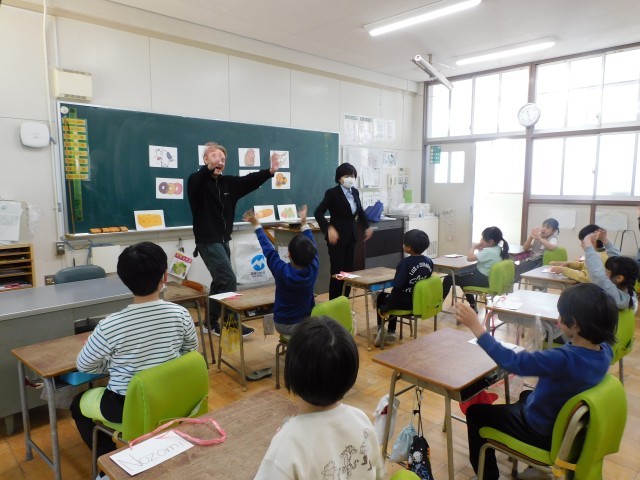 本校の1・2年生は、阿倍野区英語事業で来校されたクリス先生たちと、英語を使ったコミュニケーション活動を行いました。先生たちはほとんど英語だけで授業を進めていましたが、子どもたちは身振り手振りや表情、雰囲気から意味をつかみ取り、一生懸命やり取りを楽しんでいました。