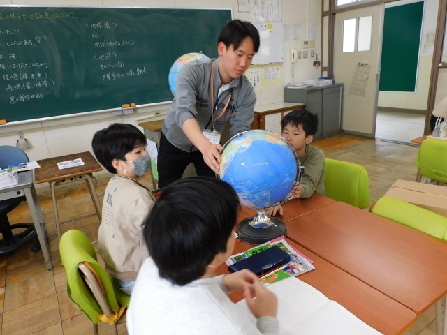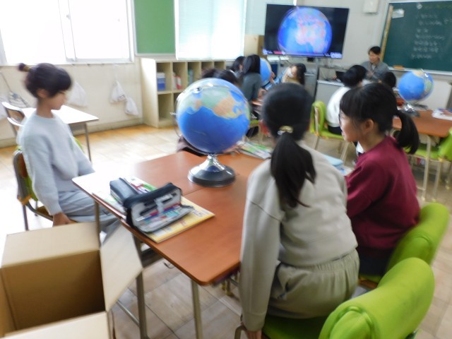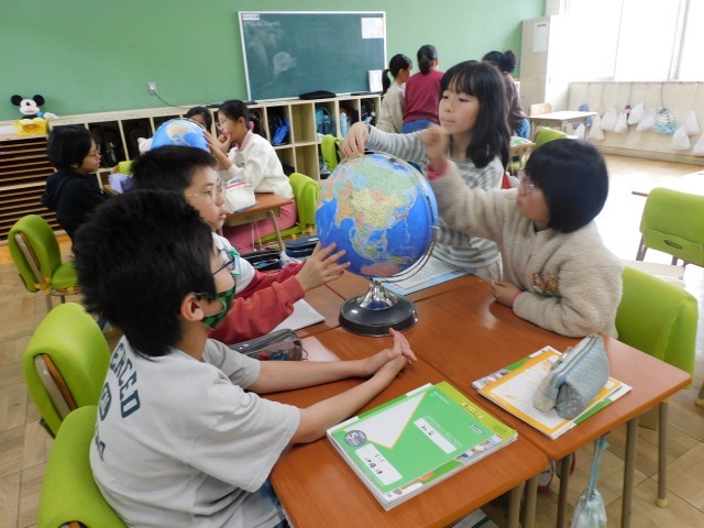 次に地球儀を手に取り、地球が球体であることを確かめながら、平面の地図との違いについて考えました。地球儀ならではの見え方や良さに気づき、これからの社会科の学習への関心が高まる時間となりました。