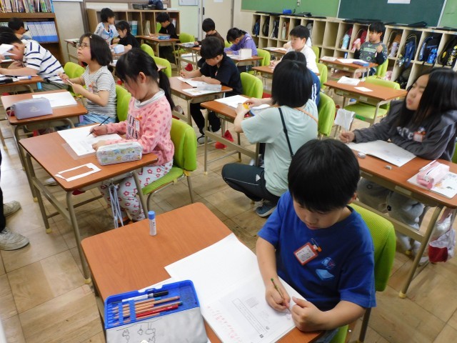 ドットを見ながら、「9を5と4に分けて考えられる」など、子どもたちからはいろいろな考え方が出てきました。目で見て分かる図を使うことで、計算の仕組みを理解しやすくなったようです。この考えが九九表の中に登場しないかけ算の答えを求めるのに活用されます。
