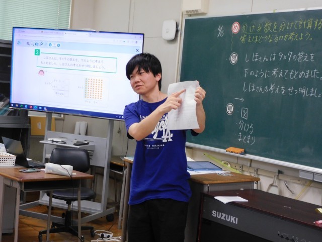3年生の算数では、「9×7」の計算の仕方について学習しました。2年生で九九として計算の仕方や答えは何度も確認してきたこの式ですが、今回は、ドット図を使って考え、かける数の「9」を分けることで、計算を簡単にする方法に取り組みました。