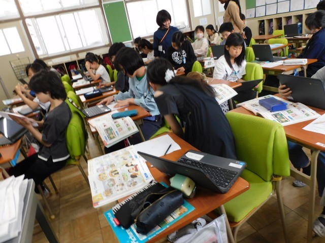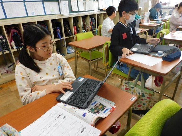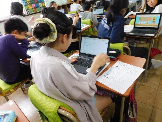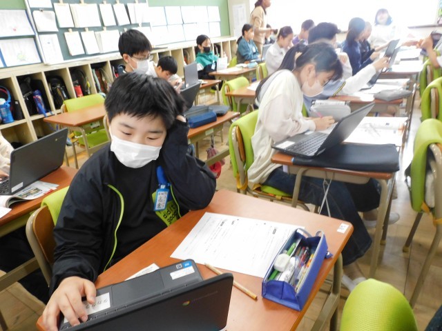 子どもたちは、タブレットを使ってキャラクターや人物について調べ、出身地や住んでいる場所などの情報を集めました。そして、集めた情報をもとに、英語でどのように表現すればよいかを考えながら、自己紹介文を作成しました。