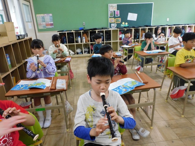3年生の音楽では、リコーダーの学習に取り組みました。今回は、新しく「シ」と「ラ」の音に挑戦しました。指で穴をしっかり押さえることで音が出ることを確かめながら、丁寧に息を吹き込んで練習しました。