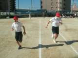体育科学習の様子です。50m走の記録を取っています。笑顔で走る6年生。それを見...