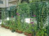 体育館前の防球ネットにツルを伸ばしているアサガオが元気いっぱいです。たくさんの...