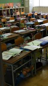 11時に大阪市の訓練情報「強い揺れに備えてください」の後、教室では、机の下に入...