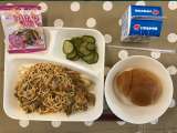 今日の献立は、・ミニ黒糖パン ・焼きそば ・きゅうりのしょうがづけ ・いもけんぴ...