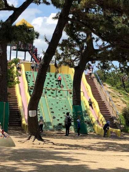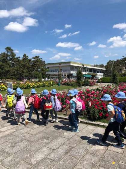 バラ園でいろいろな色のバラの花を見学しました。そのあと大きな遊具のある広場まで移動してきました。