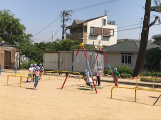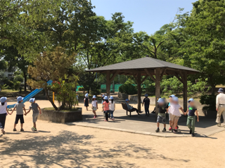 生活科の授業で、一年生は聖天山公園へ来ました。遊具だけではなく、ベンチや電灯、自動販売機などたくさんの発見をすることができました。