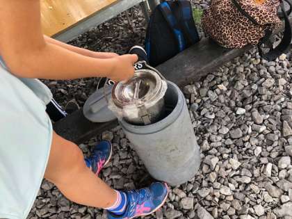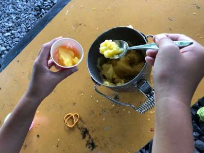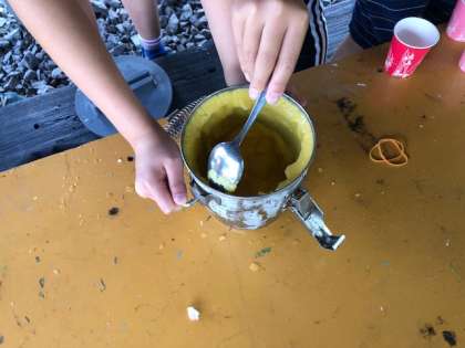 ステンレスの容器を開け、氷状の材料をスプーンで落として混ぜます。