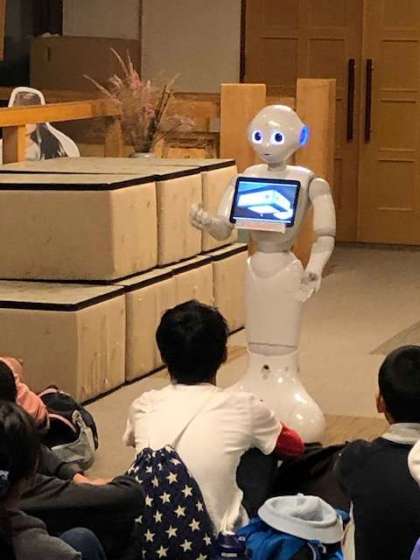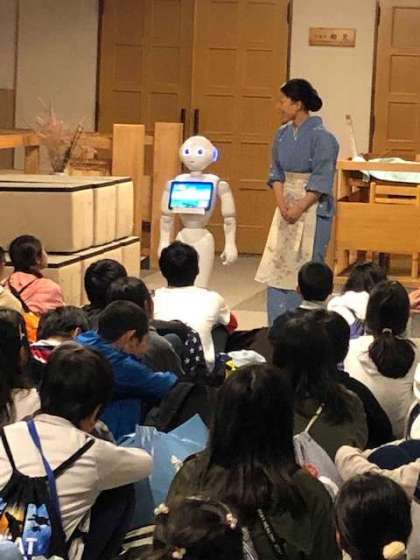 開舎式ではペッパーかしこちゃんに迎えられ、子どもたちは真剣な表情で話を聞いていました。