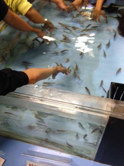 ドクターフィッシュのコーナーでは、たくさんの魚が手に…