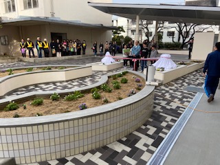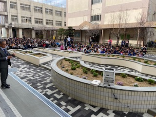 1月24日(金)100周年記念事業委員会より、子どもたちに100周年記念記念キャラクターのまるやマンとさくランがプレゼントされました。