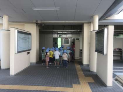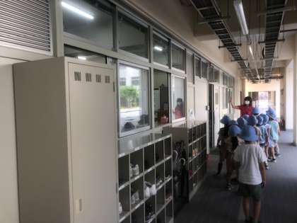 1年生が、職員室・管理作業員室・保健室などの部屋を歩いて回り、そこにいる教職員にあいさつをしました。