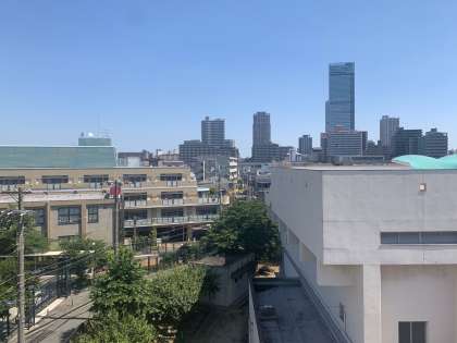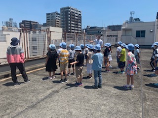 分散登校期間中に、社会科の学習として学校の屋上から、東西南北を見渡しました。めったに上がることのできない屋上に子どもたちもワクワクどきどきしていました。屋上からはあべのハルカスはもちろん、北には通天閣、西には南港のATCタワー、東には生駒山、南には堺市役所など、たくさんの発見がありました。本来ならハルカス展望台からも見たかったのですが、新型コロナウィルスが落ち着くまでの我慢です。