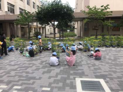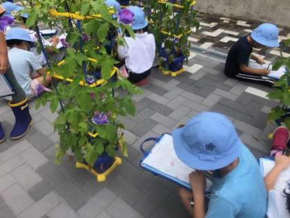 1年生が育てているアサガオの花が咲き、子どもたちが観察をした記録を、ワークシートに書いていきました。