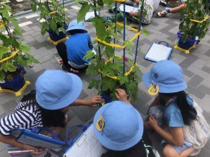 花をいろいろな角度で眺めてみたり、葉を触ってみたり、友達と気づいたことを伝えあったり、様々な方法で観察していました。