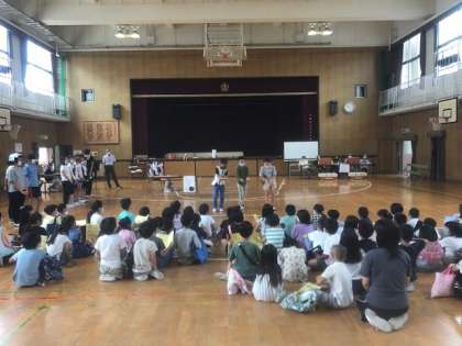 オープニングの集会では校長先生のあいさつの後、お笑いを交えて楽しく学校の紹介をしてくれました。1年生の子どもたちはくすくすと笑いながら聞いていました。