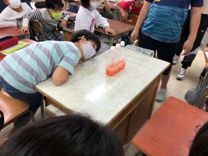 つないだ3本のペットボトルに、それぞれに量の違う色水を入れました。