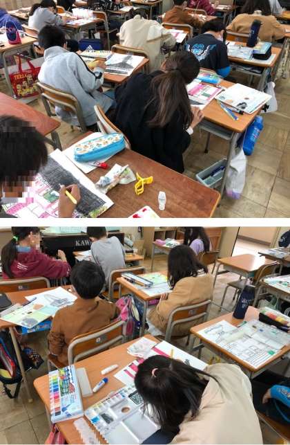 多重塔や本堂という昔の建物であり、木造建築で非常に細かいなど難しい点が多かったにもかかわらず、子どもたちは色あいや塗り方を工夫しながら制作していました。