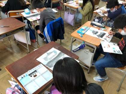子どもたちが遠足の際に写生した建物の絵に彩色していきました。