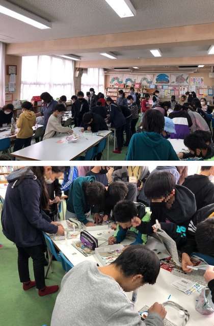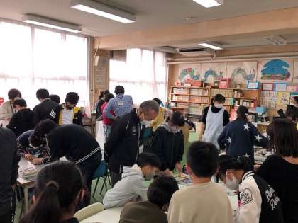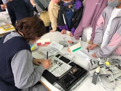 図書ボランティアの方々が新聞で作ってくださったバッグに、子どもたちがデコレーションをしていきました。キャラクターの紙を張り付けたり、自分の好きな字をボランティアの方に墨で書いていただいたり……見る見るうちに自分だけのオリジナルバッグが完成しました。休み時間が終わると、子どもたちはそのバッグをもって嬉しそうに教室に戻っていきました。
