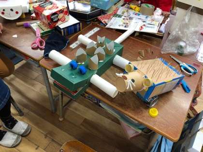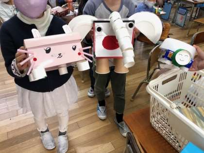 家から持ってきたいろんな種類の箱や素材を組み合わせて動物を作っています。