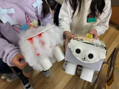 つまようじを使ってハリネズミを表現したり、綿をたくさんのせてヒツジに見立てたり、紙コップをつなぎ合わせて象の鼻にしたり……。子どもたちの豊かな発想で工夫しながら作っていました。