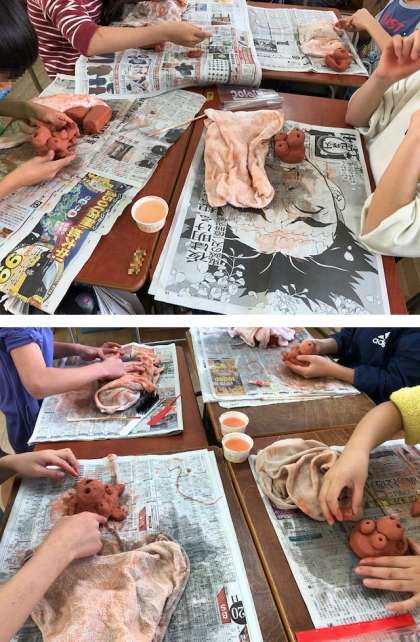 赤みがかった特殊な粘土が途中で乾燥しないように、濡れた雑巾をこまめにかけながら作っていきました。
