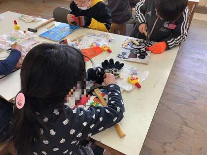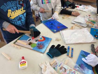 子どもたちはビー玉がうまく転がるように考えながら、くぎ打ちを楽しんでいました。