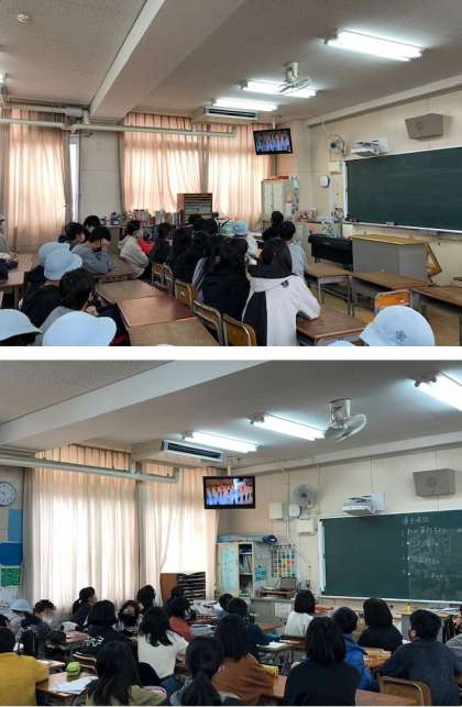 校長先生のお話の後、各クラスで撮影された“ありがとうの花”の手話うたをみんなで見ました。