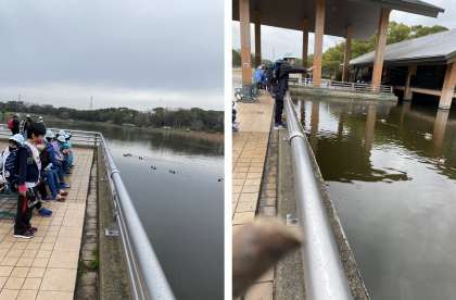 雨宿り場所近くの池にいる野鳥を観察をしています。